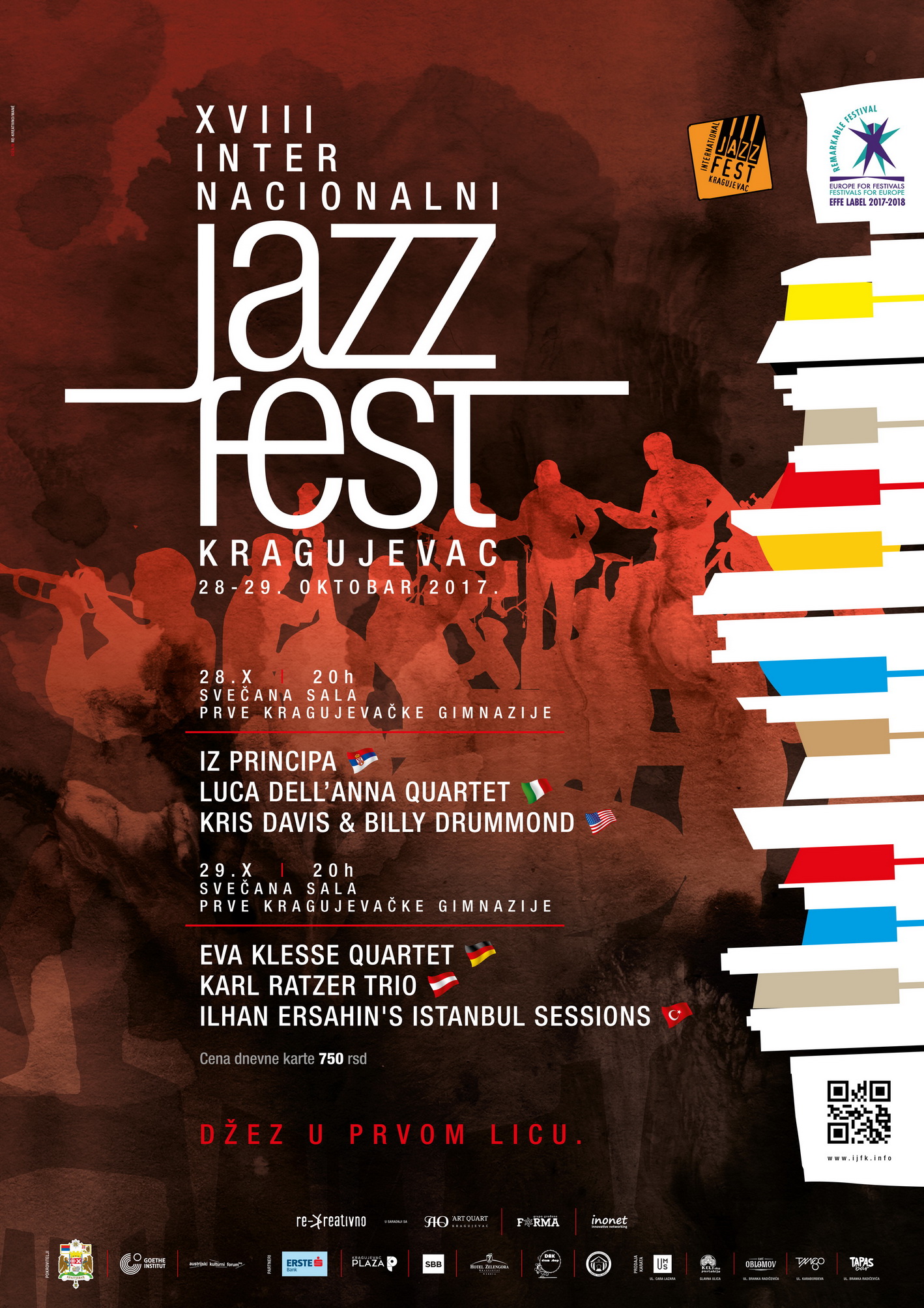 Subotički omladinski bend Iz Principa, sačinjen od srednjoškolaca rođenih u godini kada je organizovan prvi JazzFest u Kragujevcu, simbolično će otvoriti 18. IJFK i na taj način potvrditi značaj Festivala poznatog kako po afirmaciji mladih Džez bendova, isto tako i muzičkoj edukaciji omladine. Iste večeri uz nove nade domaće džez scene nastupiće i pijanista Luka Del’ Ana iz Italije sa svojim kvartetom, kao i Kanađanka Kris Dejvis, o kojoj je Njujork Tajms pisao kao o ,,pilotu na tastaturi” i ona će se kragujevačkoj publici predstaviti u kombinaciji sa bubnjarem Bili Drumondom. Druge večeri publika će moći da uživa u nastupu Eve Klese iz Nemačke i njenog benda, zatim u izvođenju trija Karl Racera iz Austrije, muzičara svetske klase, da bi na samom kraju kao poslastica nastupio bend iz Turske, čiji je frontmen Ilhan Ersahin predstavnik njujorške andergraund scene, koji osim što inspiraciju pronalazi u filmu, u svojoj muzici spaja istok i zapad, romsku muziku i elitu evropskih prestonica.