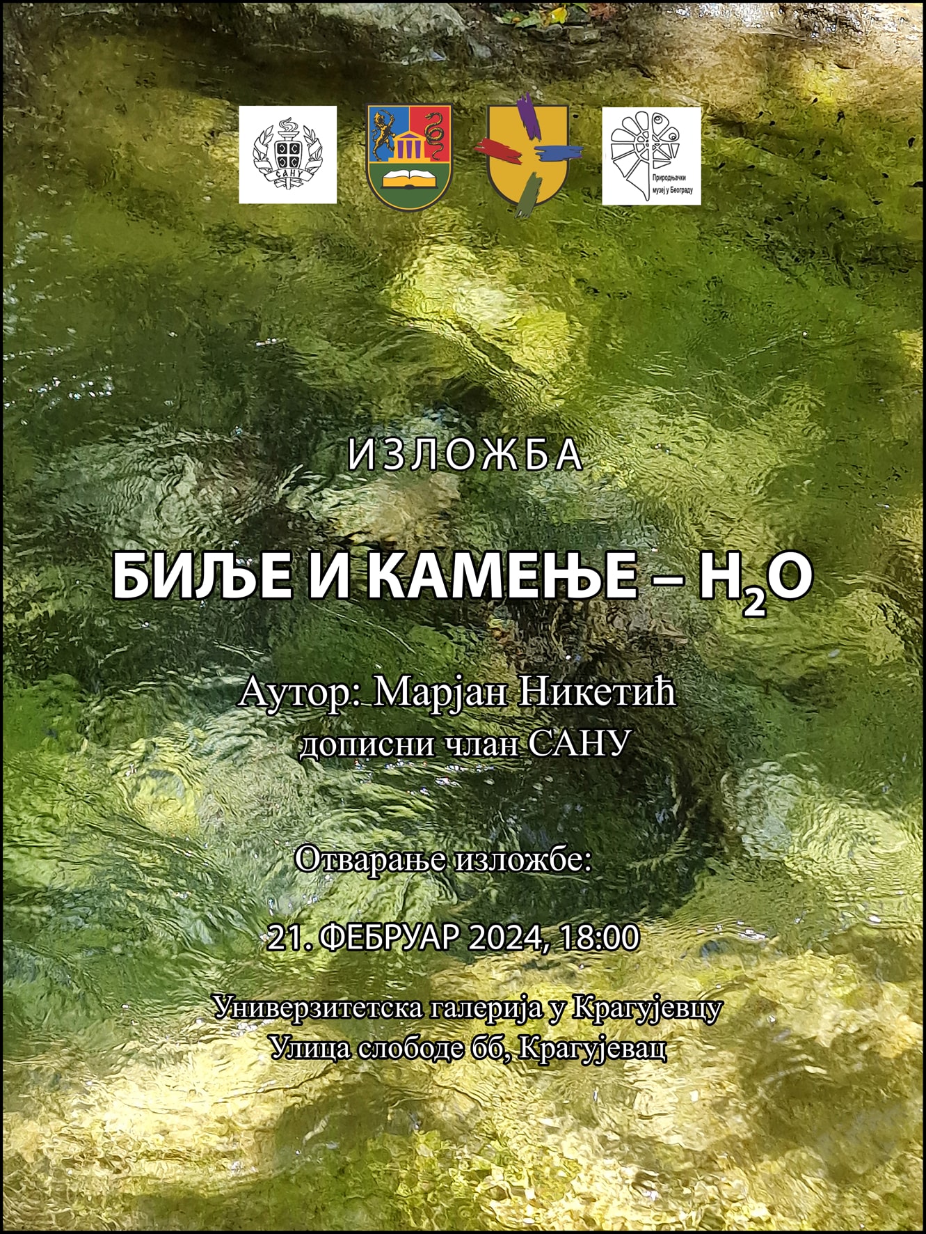 U organizaciji Centra za naučnoistraživački rad SANU i Univerziteta u Kragujevcu, a u saradnji sa Prirodnjačkim muzejom u Beogradu, večeras od 18 sati u Univerzitetskoj galeriji biće otvorena izložba „Bilje i kamenje – H2O“, čiji je autor dr Marjan Niketić, dopisni član SANU.