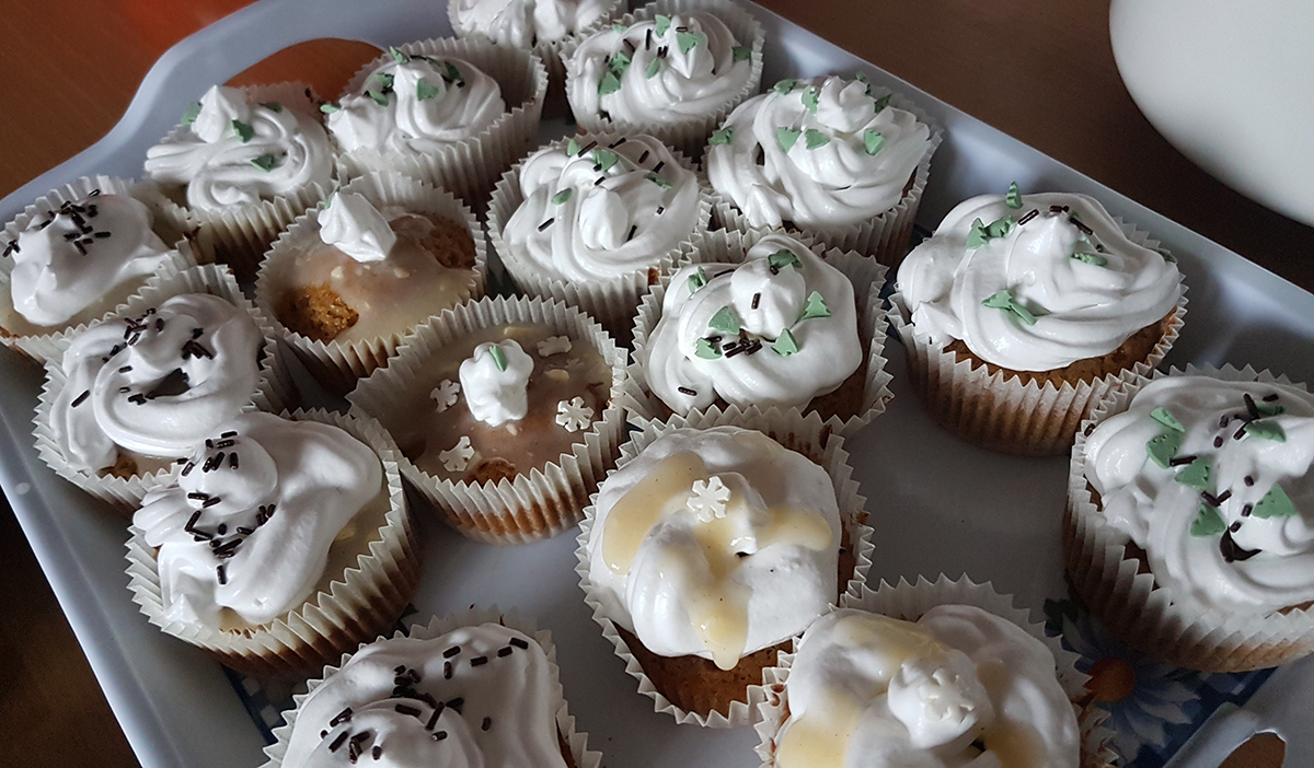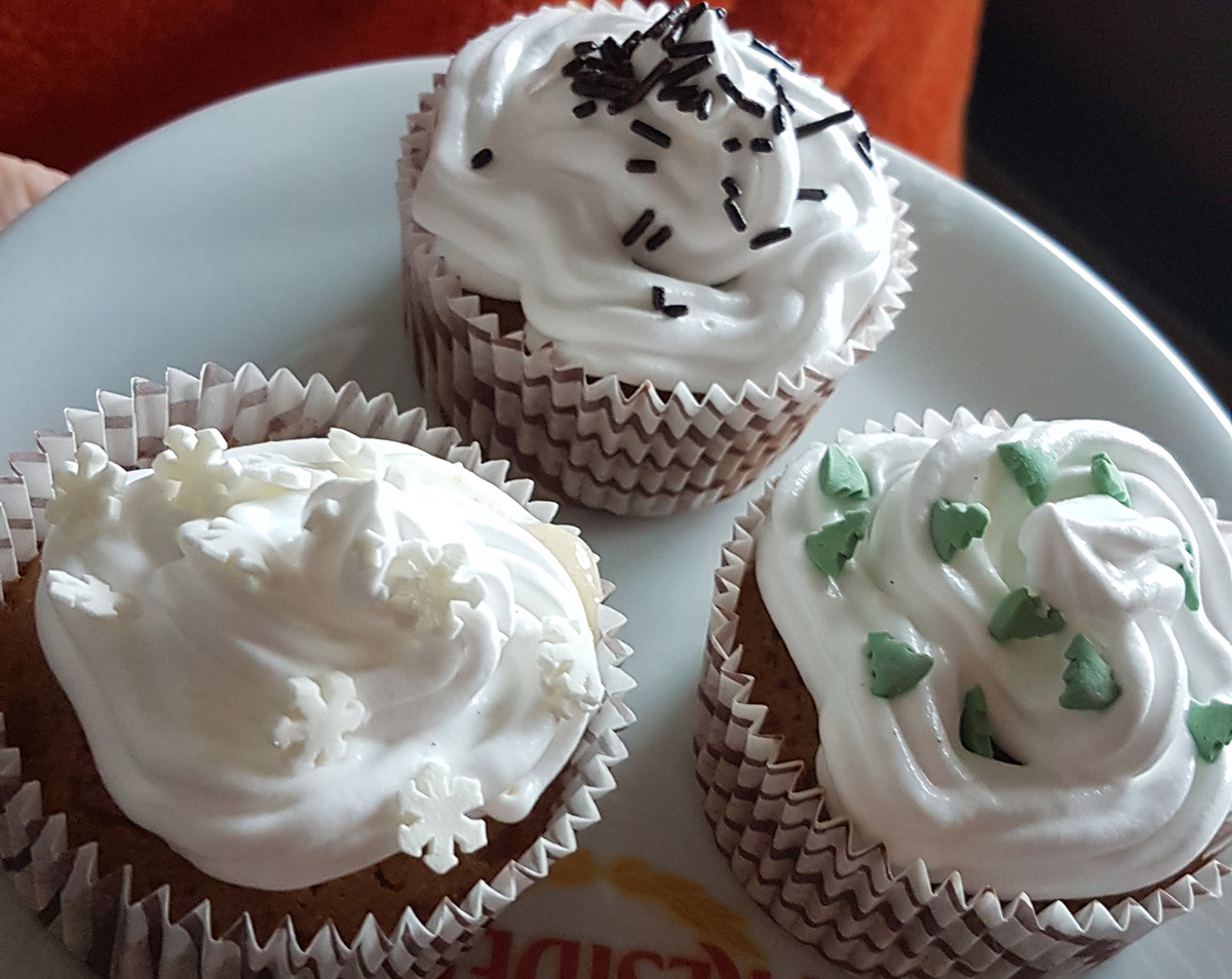 Takvu smesu sipati u korpice za cupcakes, otprilike do visine korpice, i peći na 200° 20 – 25 minuta. Dok se peku, napravite preliv (glazuru). Prvo dobro pomešajte šećer u prahu sa otopljenim puterom, te dodajte ostale sastojke, i umutite ih ručnim mikserom. Kada se testo ispeče, sačekajte da se prohladi na sobnoj temperaturi. Nakon toga preliv sipajte u kuhinjski špric za dekorisanje, te kružnim pokretima formirajte ukras na vašim kolačićima. Dekorisati po ukusu jestivim pahuljicama, jelkicama, listićima. Ostavite da se ohlade prirodno ili u frižideru i servirajte. Uživajte u harmoniji ukusa.