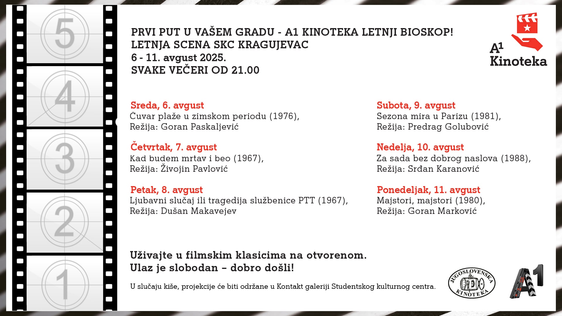 U organizaciji A1 Srbija i Jugoslovenske kinoteke, od 6. do 11. avgusta, na Letnjoj sceni Studentskog kulturnog centra Kragujevac, svakog dana u 21 čas biće prikazani neki od najznačajnijih filmova domaće kinematografije, uz besplatan ulaz.
