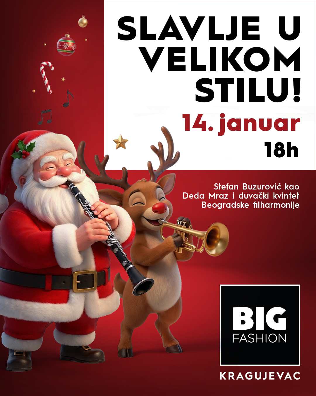 I još jedna lepa vest stiže u BIG ritmu! U sredu, 14. januara sa početkom u 18 sati u atrijumu BIG FASHION Kragujevac centra biće održan koncert duvačkog kvinteta Beogradske filharmonije i Stefana Buzurovića. Ne propustite priliku da uživate!