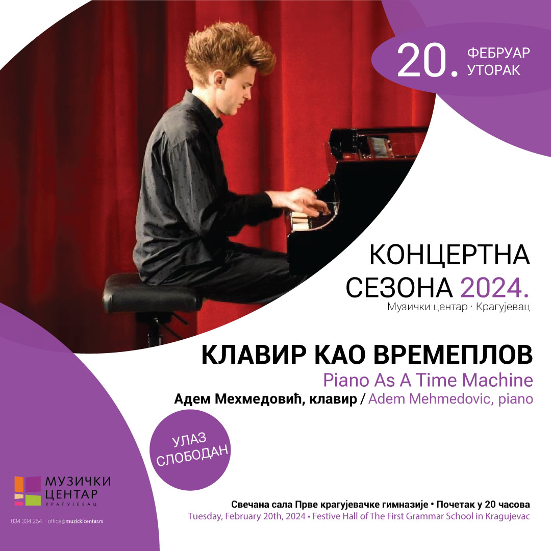 U Svečanoj sali Prve kragujevačke gimnazije, večeras od 20 sati, biće održan koncert Adema Mehmedovića pod nazivom „Klavir kao vremeplov“. Koncert organizuje Muzički centar Kragujevac.