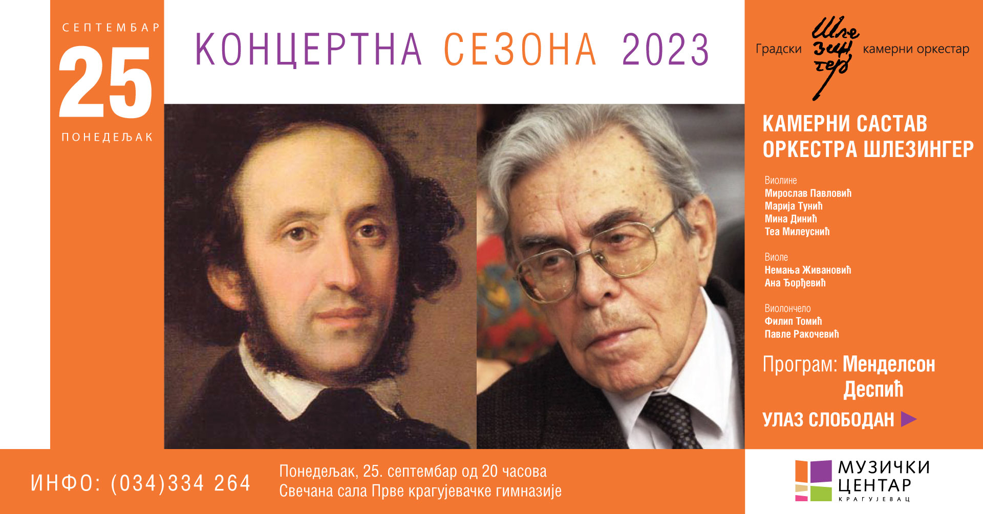 Violine će svirati Miroslav Pavlović, Marija Tunić, Mina Dinić i Tea Mileusnić, viole Nemanja Živanović i Ana Đorđević dok će violončela svirati Filip Tomić i Pavle Rakočević. Na programu će biti dela Mendelsona i Despića.