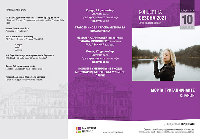 Muzički centar organizuje koncert litvanske pijanistkinje Morte Grigaliunaite, u petak, od 20 časova, u Svečanoj sali Prve kragujevačke gimnazije.