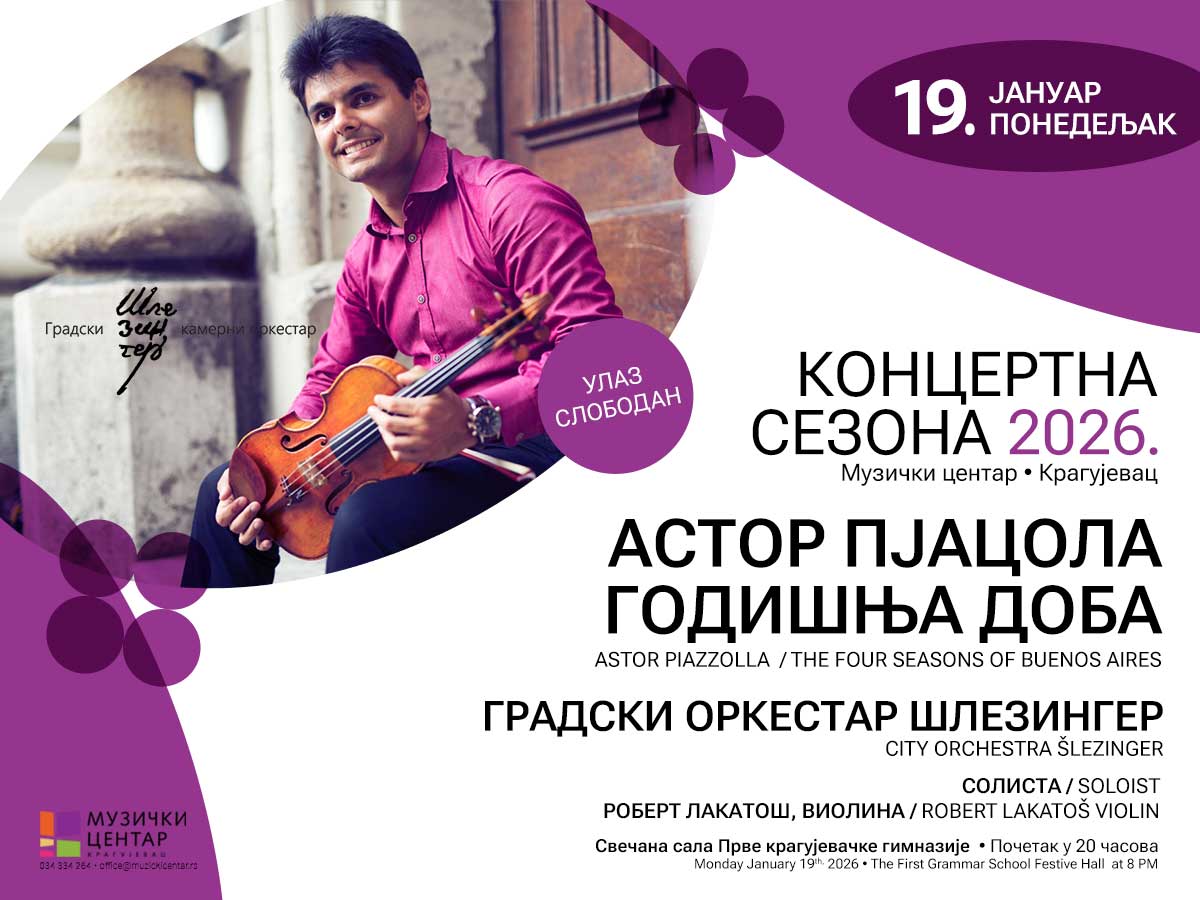 U ponedeljak 19. januara, od 20 časova u Svečanoj sali Prve kragujevačke gimnazije Muzički centar otvara sezonu koncertom Gradskog orkestra „Šlezinger“ sa izuzetnim solistom, violinistom Robertom Lakatošem.
