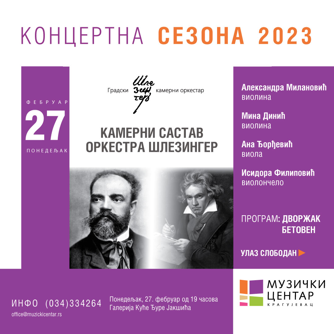 Muzički centar Kragujevac, u okviru koncertne sezone, organizuje koncert kvarteta koji čine članovi Gradskog kamernog orkestra “Šlezinger”.