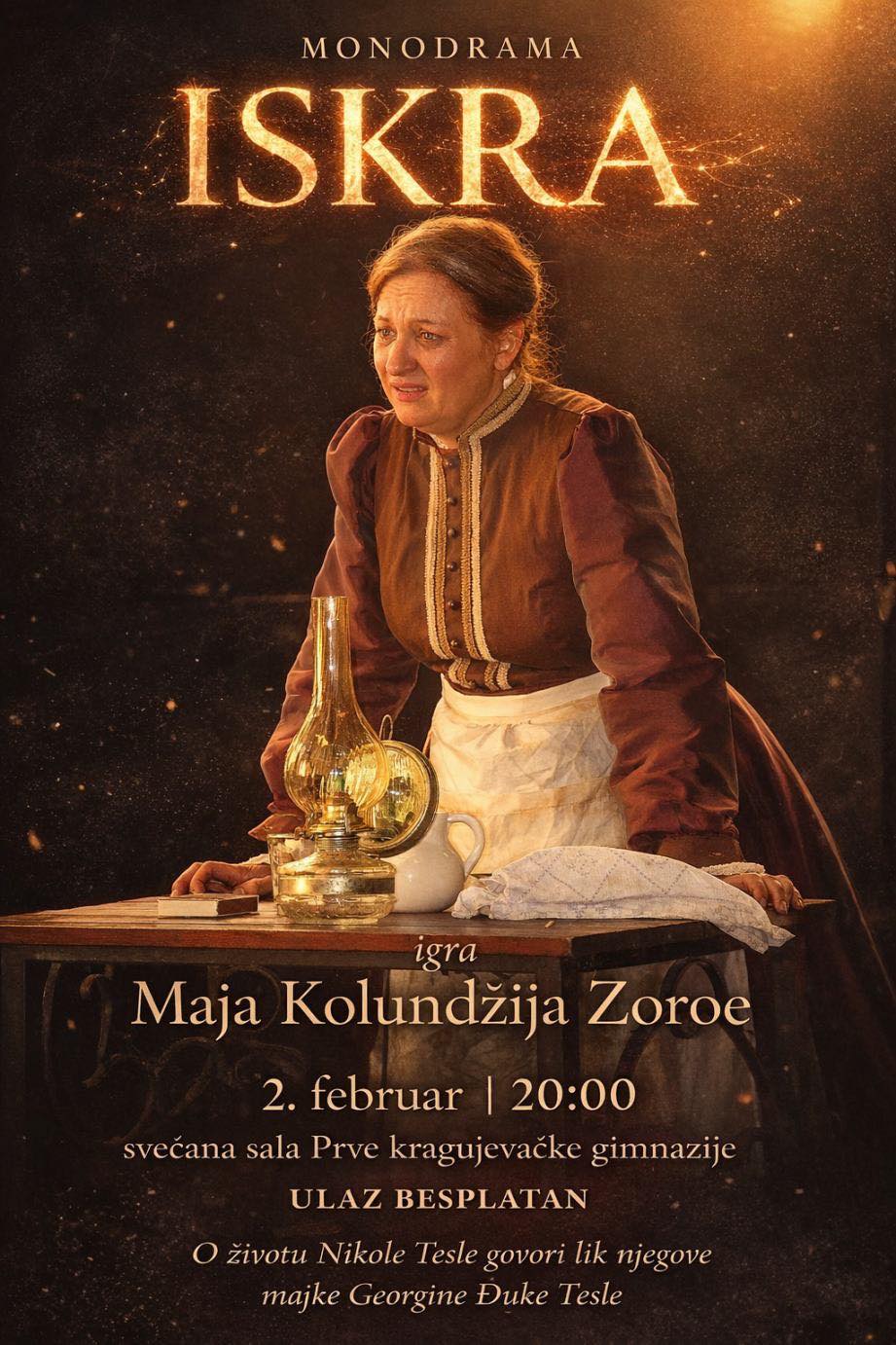 Monodrama „Iskra” koja govori o životu Nikole Tesle, iz vizure njegove majke, biće izvedena večeras u 20 sati u Svečanoj sali Prve Kragujevačke gimnazije.