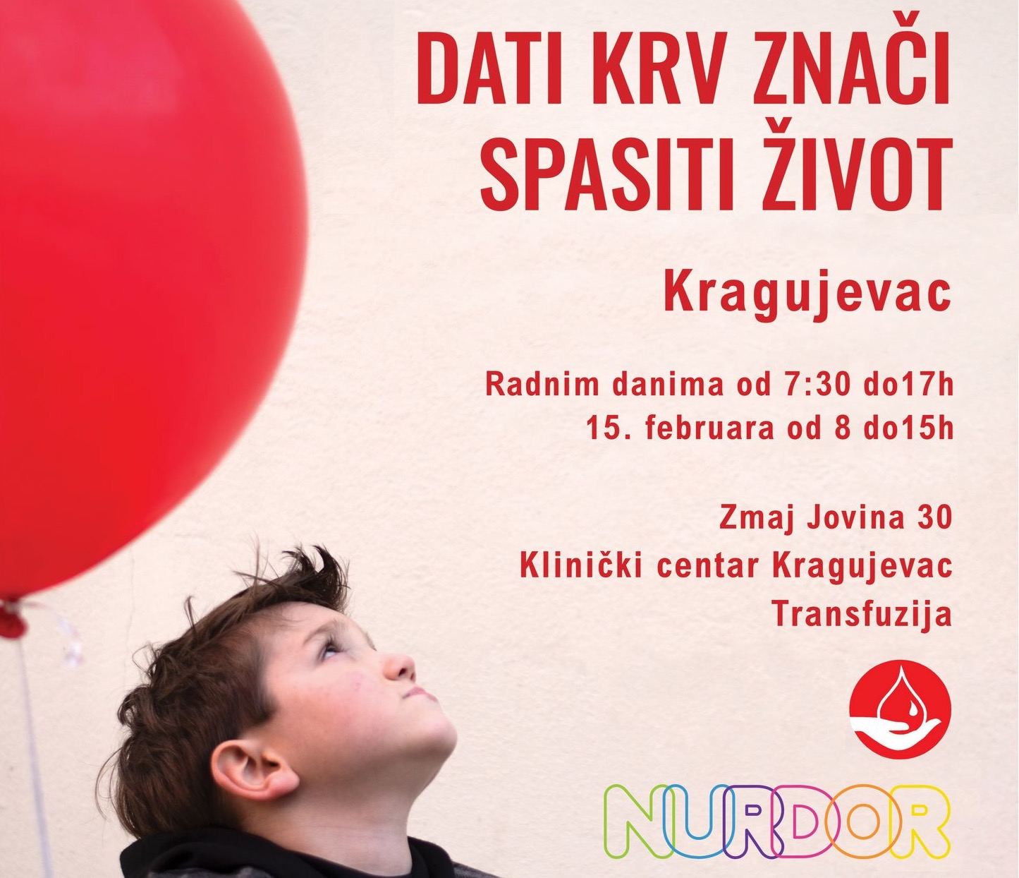 Pozivamo sve građane Kragujevca da dođu 15. februara od 8 do 15 časova i od 16. do 28. februara od 7 do 19 časova u Službu za transfuziju Kliničkog Centra, postanu dobrovoljni davaoci krvi i zajedno sa nama pokažu da je svaki život važan.