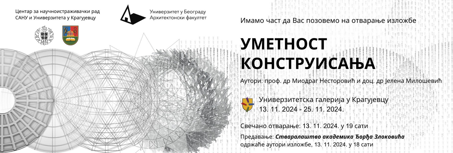 Centar za naučnoistraživački rad SANU i Univerziteta u Kragujevcu organizuje izložbu „Umetnost konstruisanja“ koja sadrži ključne projekte i inženjerska ostvarenja akademika Đorđa Zlokovića (1927-2017), kao i najuspešnije radove studenata arhitekture. Naziv izložbe označava pristup koji je akademik Đorđe Zloković koristio u svom istraživačkom i stručnom radu, a koji je šezdesetih godina prošlog veka uspešno preneo i u polje edukacije.