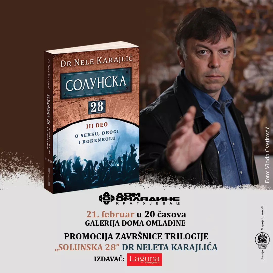Promocija romana Neleta Karajlića “Solunska 28“ biće održana 21. februara od 20 sati u Galeriji Doma omladine Kragujevac.