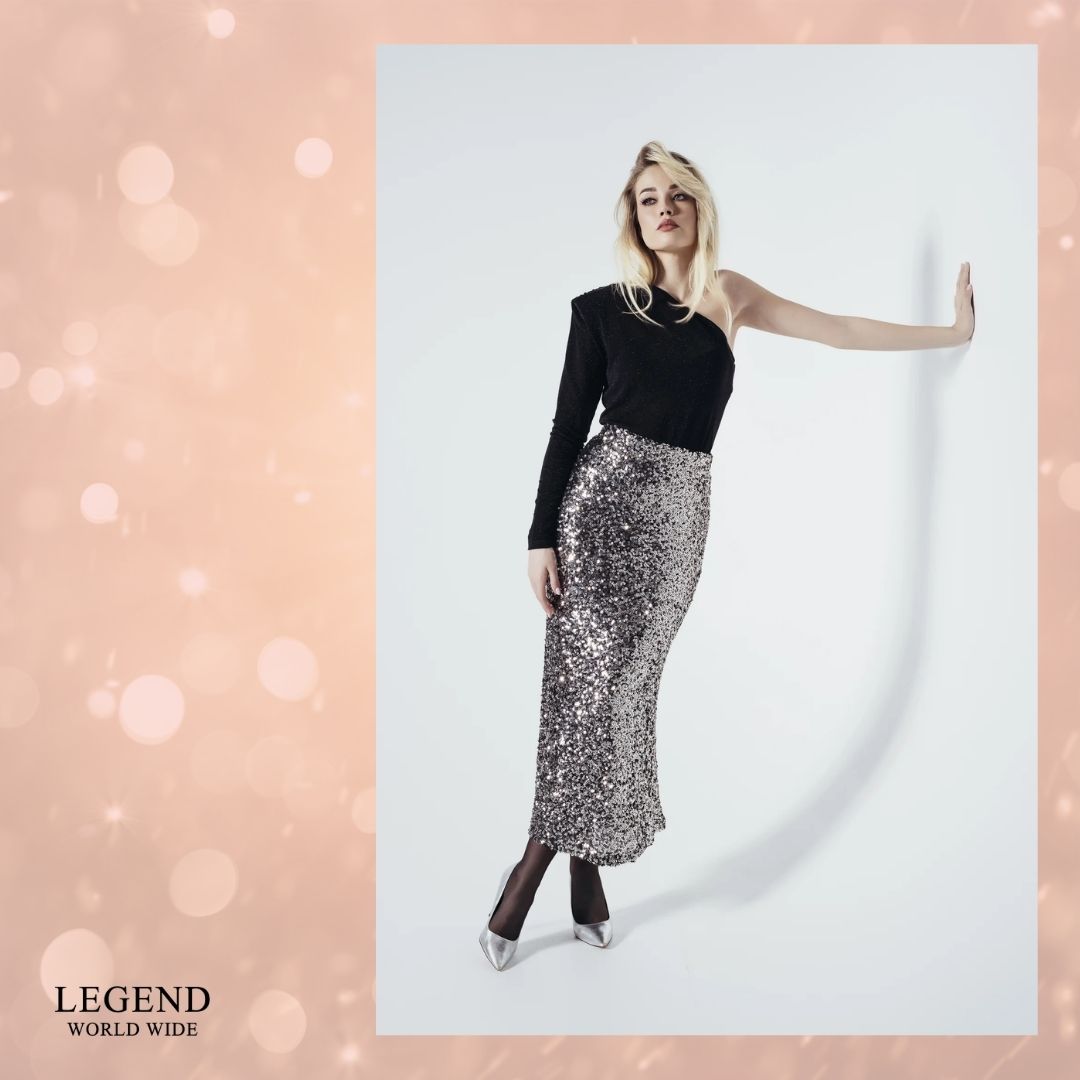 Upečatljiva metalik suknja iz Legend ponude u BIG FASHION Kragujevac centru prati liniju tela i daje graciozan efekat pri svakom koraku zahvaljujući srebrnim šljokicama. Uz crnu klasičnu majicu ili košulju je pun pogodak.