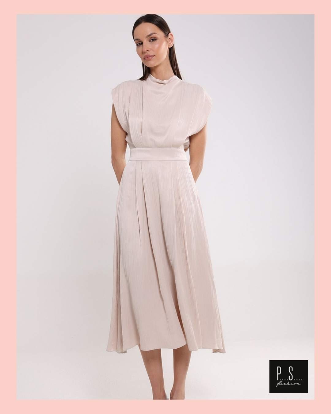Romantična, ležerna i istovremeno elegantna, udobna – haljina od viskoze u bež boji je savršen izbor za prolećne prilike. Visoki okovratnik i elegantno drapirani rukavi donose dašak profinjenosti, dok naglašeni struk ističe siluetu.