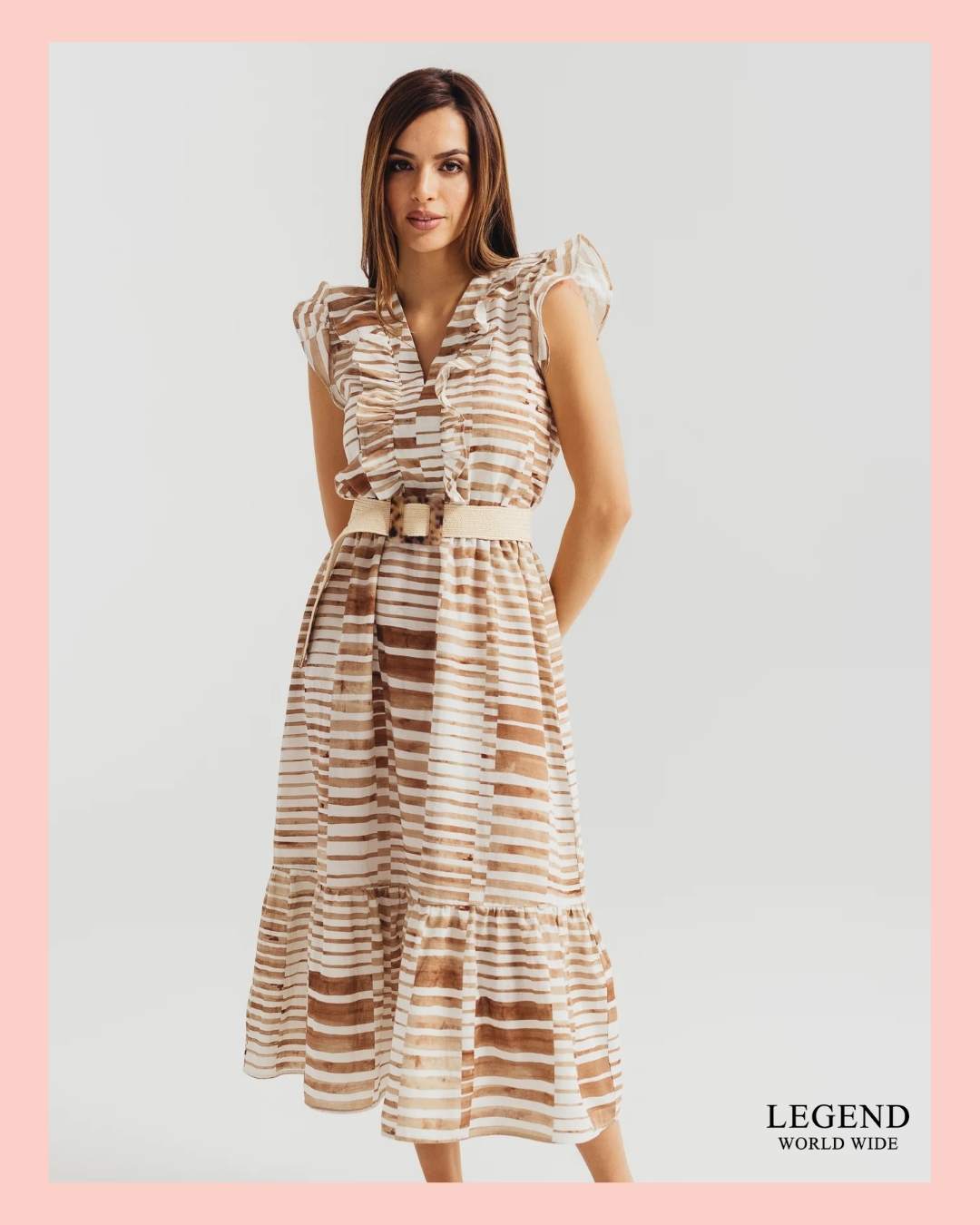 Lepršava midi haljina izrađena od pamuka i lana, savršen je izbor za predstojeće tople dane. Volani na rukavima i naglašen struk pružaju sofisticiran i ženstven izgled u svakoj prilici. Print neutralnih boja ostavlja pregršt mogućnosti za kombinovanje sa različitim tipovima aksesoara i obuće i sigurni smo da ćete ovakvu haljinu obožavati ove sezone.