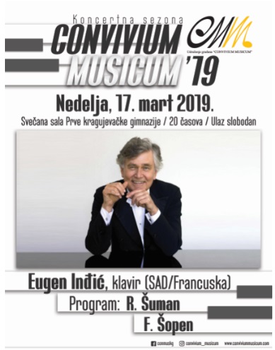 Čuveni svetski pijanista nastupiće u Svečanoj sali Prve kragujevačke gimnazije 17. marta 2019. godine u 20 sati, u okviru koncertne sezone Convivium Musicum `19. Ulaz na koncert je slobodan, a ljubitelji muzike će imati prilike da čuju dela Frederika Šopena i Roberta Šumana.