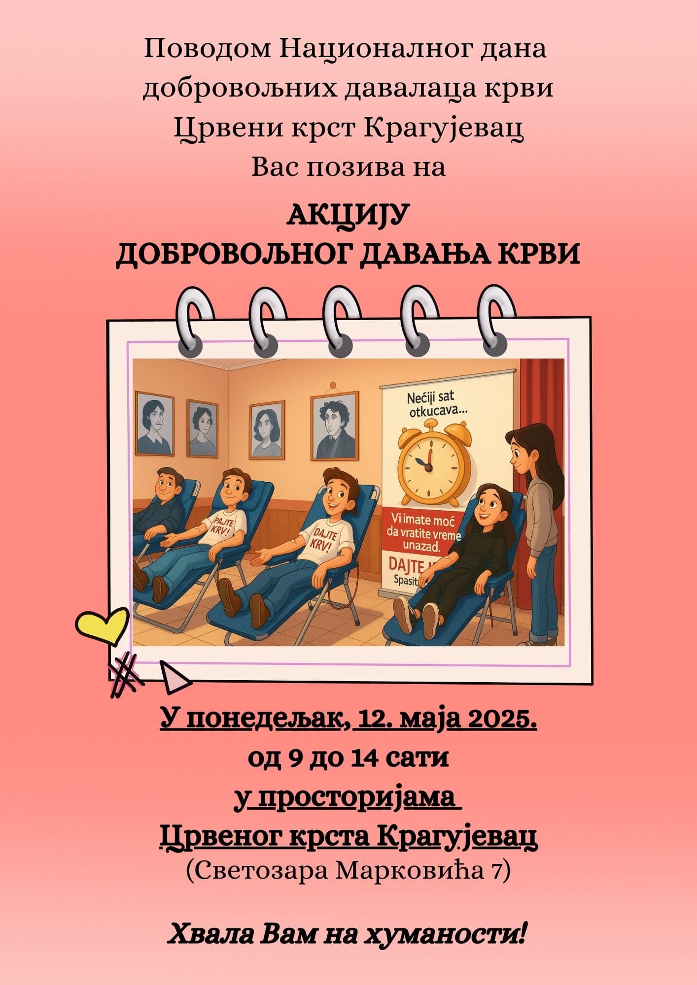 Povodom Nacionalnog dana dobrovoljnih davalaca krvi koji se obeležava 11. maja, Crveni krst Kragujevac u saradnji sa Bolničkom bankom krvi Univerzitetskog kliničkog centra Kragujevac, a uz podršku Grada Kragujevca, u ponedeljak 12. maja organizuje akciju dobrovoljnog davanja krvi od 9 do 14 sai u prostorijama Crvenog krsta.
