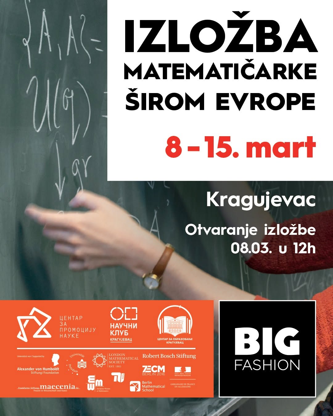 Centar za promociju nauke u saradnji sa Naučnim centrom Kragujevac organizuje izložbu Matematičarke širom Evrope od 8. do 15. marta u atrijumu BIG FASHION Kragujevac centra. Po prvi put u Kragujevcu biće predstavljena izložba sa fotografskim portretima i intervjuima sa 13 matematičarki iz zemalja Evrope. Intervjui govore o životnom i profesionalnom putu matematičarki i nedvosmisleno poručuju da ne postoji univerzalni recept za postizanje uspeha, ali i da se matematika i svakodnevni život neminovno prepliću.