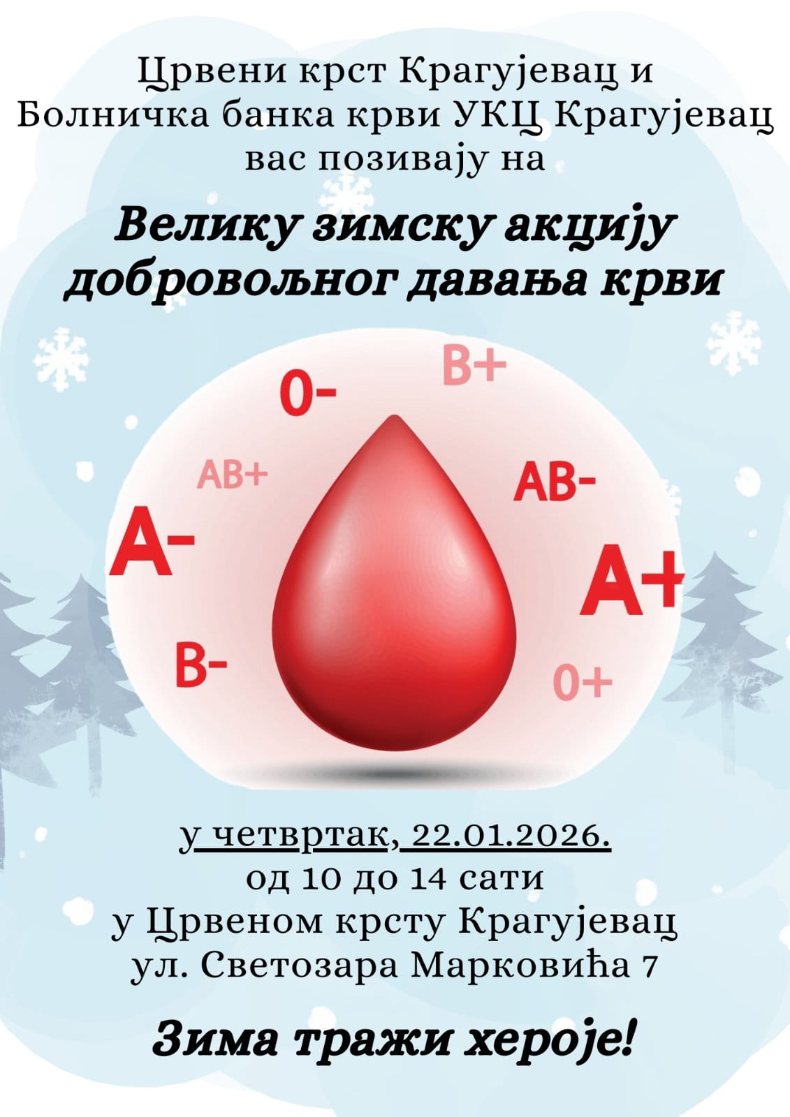 Pod sloganom „Zima traži heroje”, velika zimska akcija dobrovoljnog davanja krvi biće održana sutra od 10 do 14 sati u prostorijama Crvenog krsta. Cilj ove akcije je da se obezbede dovoljne zalihe krvi za pacijente koji se nalaze na lečenju u Univerzitetskom kliničkom centru.
